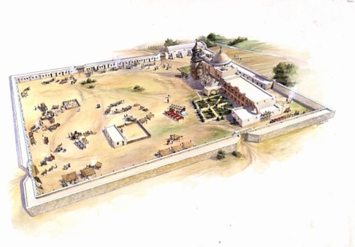Aerial view of Mission San Jose, c1780 depicts people engaged in various activities within the mission's courtyard ranging from tanning to cooking to socializing.