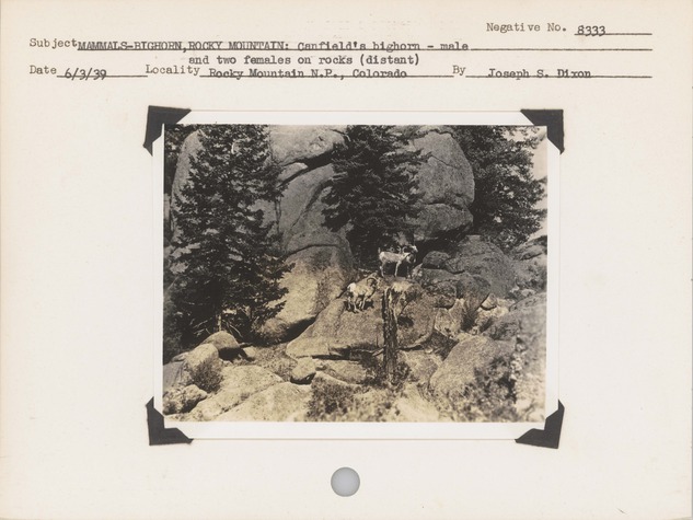 Mammals--Bighorn, Rocky Mountain--Canfield's Bighorn-Male and two females on rocks (distant). Locality: Rocky Mountain National Park, Colorado. Negative #: 8333