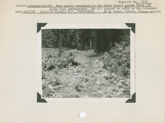 Mammals- Wapiti [Elk]: When nearly concealed in the dense forest growth about 150 yards from photographer, the elk stopped to stare at the intruder. Negative #: 7175. Locality: Olympic National Park, Washington.