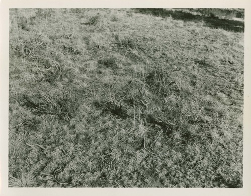 Browsed vegetation in unfenced plot (6A) in Tuxedo Park. Purshia, yellow pine and sage in right center are same as in close up. Locality: Rocky Mountain National Park. Negative #: 10801