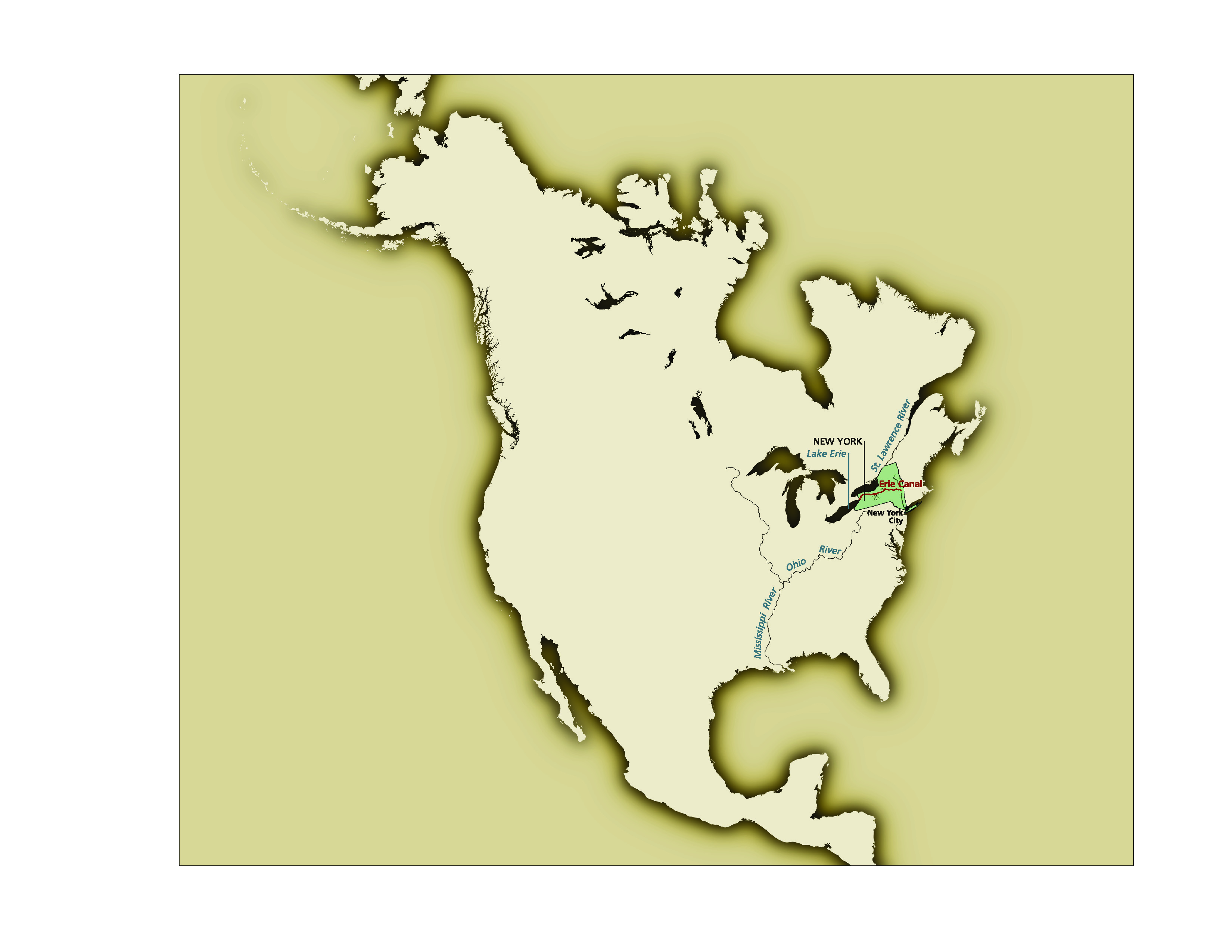 Map of continental North America with the state of New York shaded in green. The Erie Canal is shown as a red line cutting across the width of New York. The rest of the continent is shown in light beige with the oceans around it in a darker shade of peanut brown.