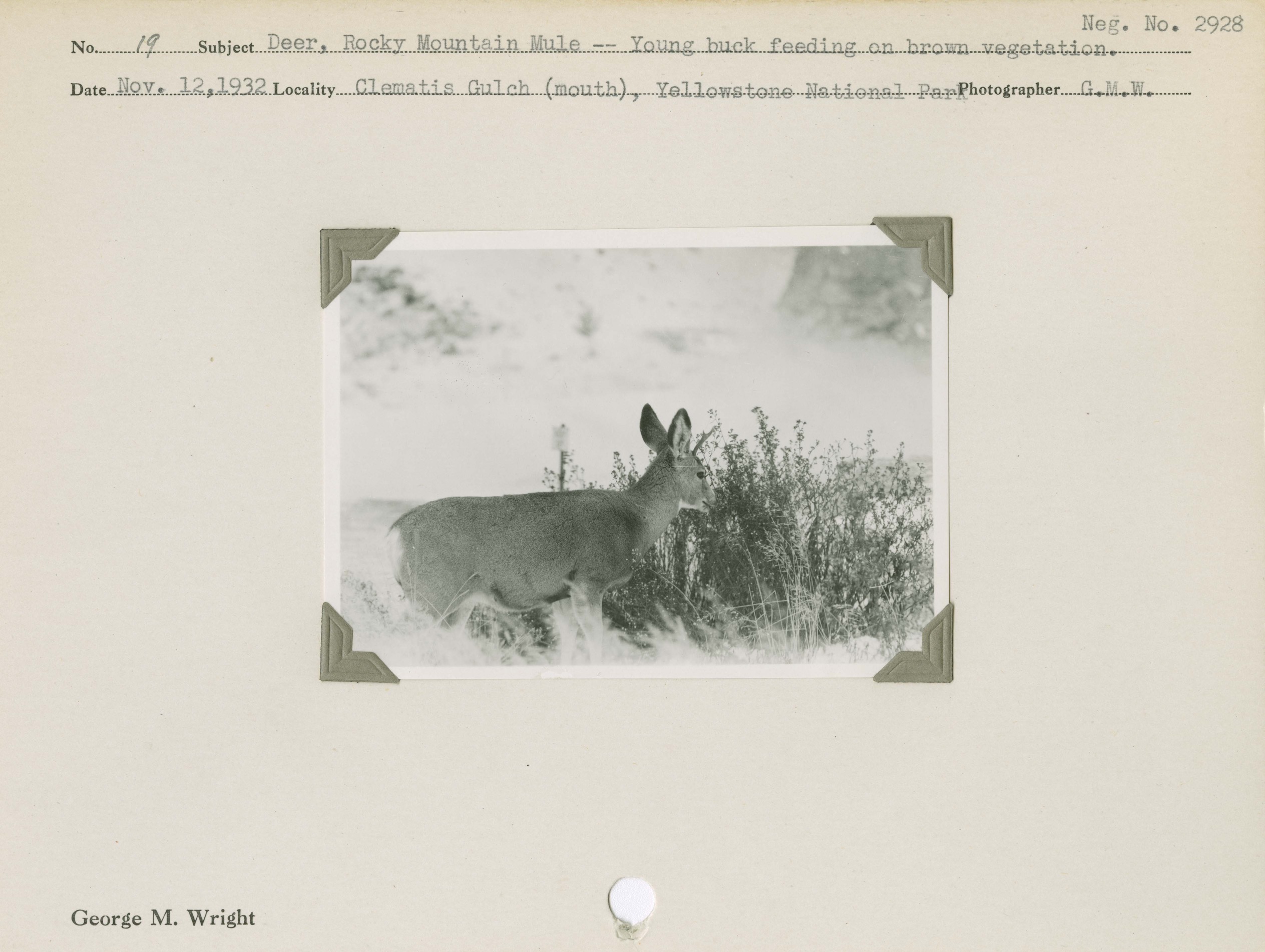 Deer, Rocky Mountain Mule: Young buck feeding on brown vegetation. Negative #: 2928. Locality: Clematis Gulch (mouth), Yellowstone National Park.