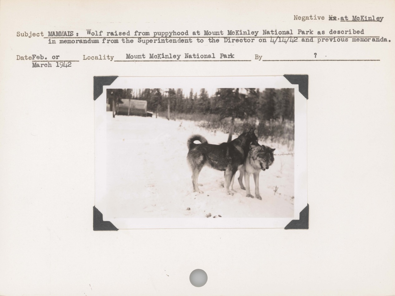 Mammals--Wolf raised from puppyhood at Mount McKinley National Park as described in memorandum from the Superintendent to the Director on 4/14/1942 and previous memoranda. Locality: Mount McKinley National Park [Denali National Park & Preserve]. No negative on file