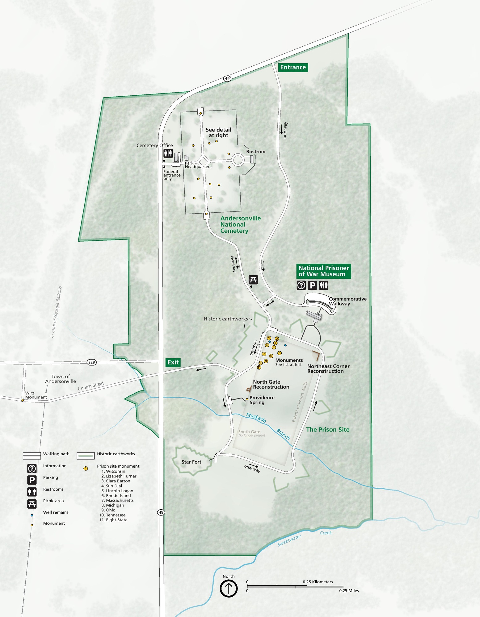 Map of Anderson National Historic Site in Georgia. Park property is indicated in green. State Route 49 borders part of the park’s northern and western edges and Sweetwater Creek the southern edge. The surrounding areas are pale gray.