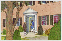 Colonial men having a conversation at the door of a brick house.
