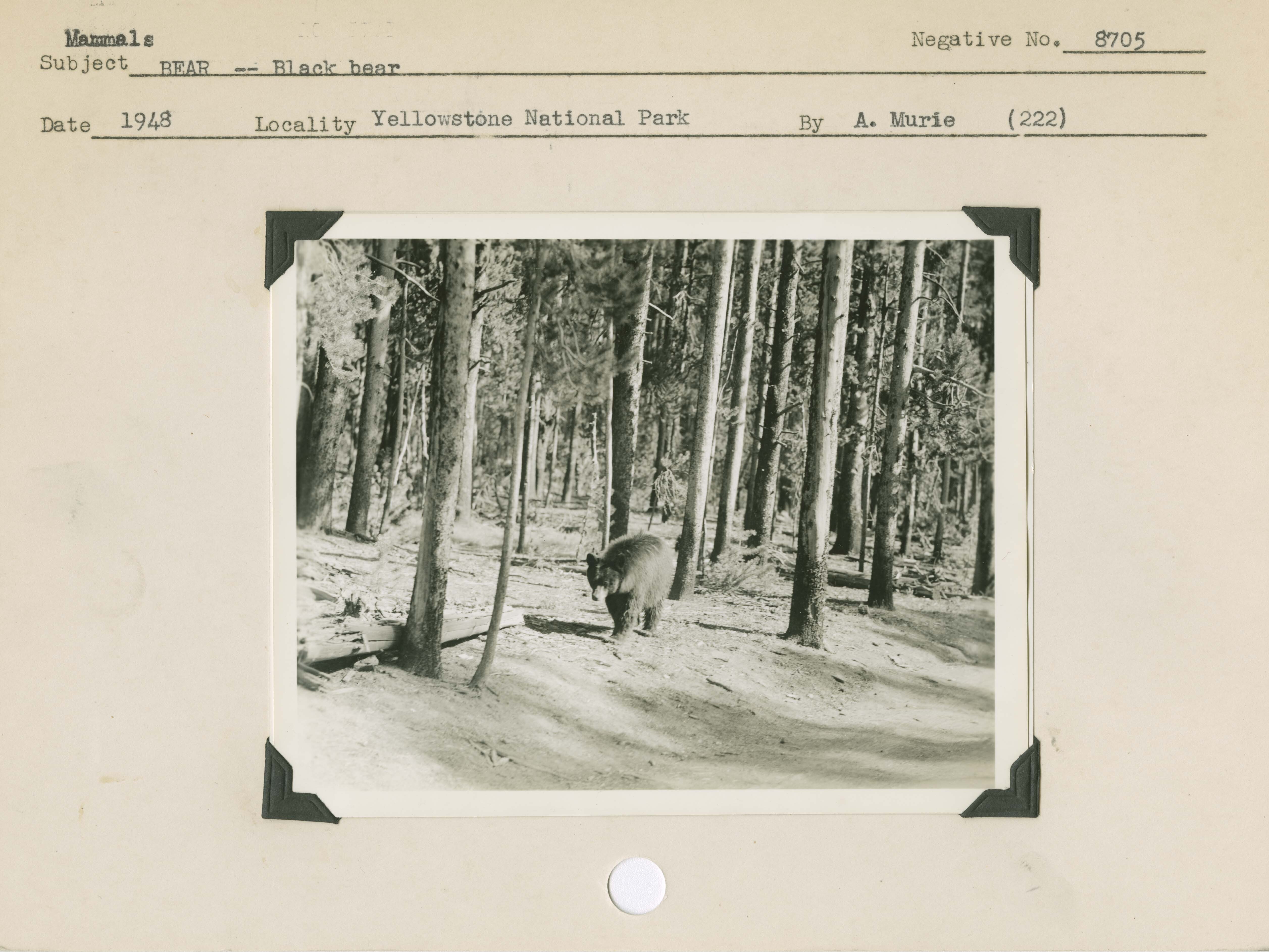 Bear – Black bear. Locality: Norris, Yellowstone National Park. Negative #: 8705. Location of Negative: Region Four Headquarters. [The more specific date and location comes from the reverse of the envelope for this negative number.]