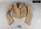 Jacket made of tan suiting material with shadow cord effect. Cotton lining with two patches of heavy overcoat material basted on the front panel for warmth. Nine buttonholes on the right side. Evidence of nine buttons having been sniped off. Collar made of two pieces.