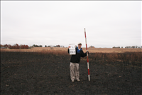 A person standing in the prairie with a stadia rod and a sign. The sign indicates which area of the prairie is being monitored and the rod provides a consistent scale. During 2010 SCA interns assisted with several projects including water quality monitoring, environmental education, and photographic monitoring.