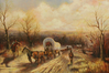 There were no gayly colored banners to welcome the pioneers to the new country, so the artist chose to weave their depiction in an array of color. This painting has as its setting the Oregon Trail crossing the toll bridge at Rock Creek near Endicott, Nebraska. The time...one morning in early spring.