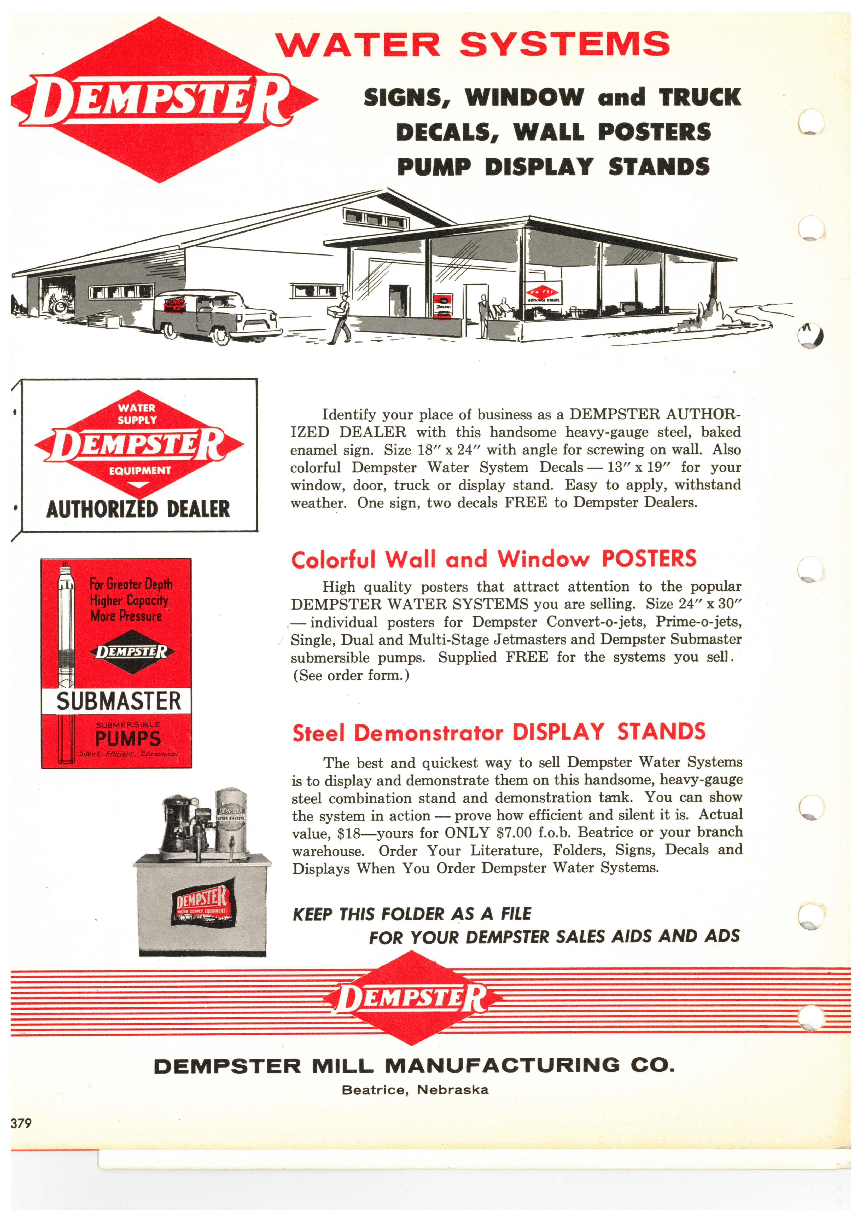 Identify your place of business as a Dempster Authorized Dealer with this handsome heavy-gauge steel, baked enamel sign. Size 18" x 24" with angle for screwing on wall. Also colorful Dempster Water System Decals--13" x 19" for your window, door, truck or display stand. Easy to apply, withstands water. One sign, two decals FREE to Dempster Dealers.