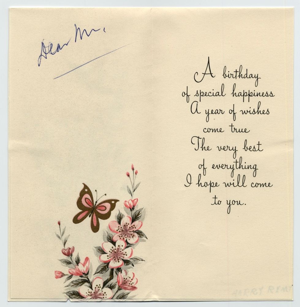 A birthday card from Harry Remy to Bess Truman. The card has butterfly and flower illustrations on the front and inside of the card.