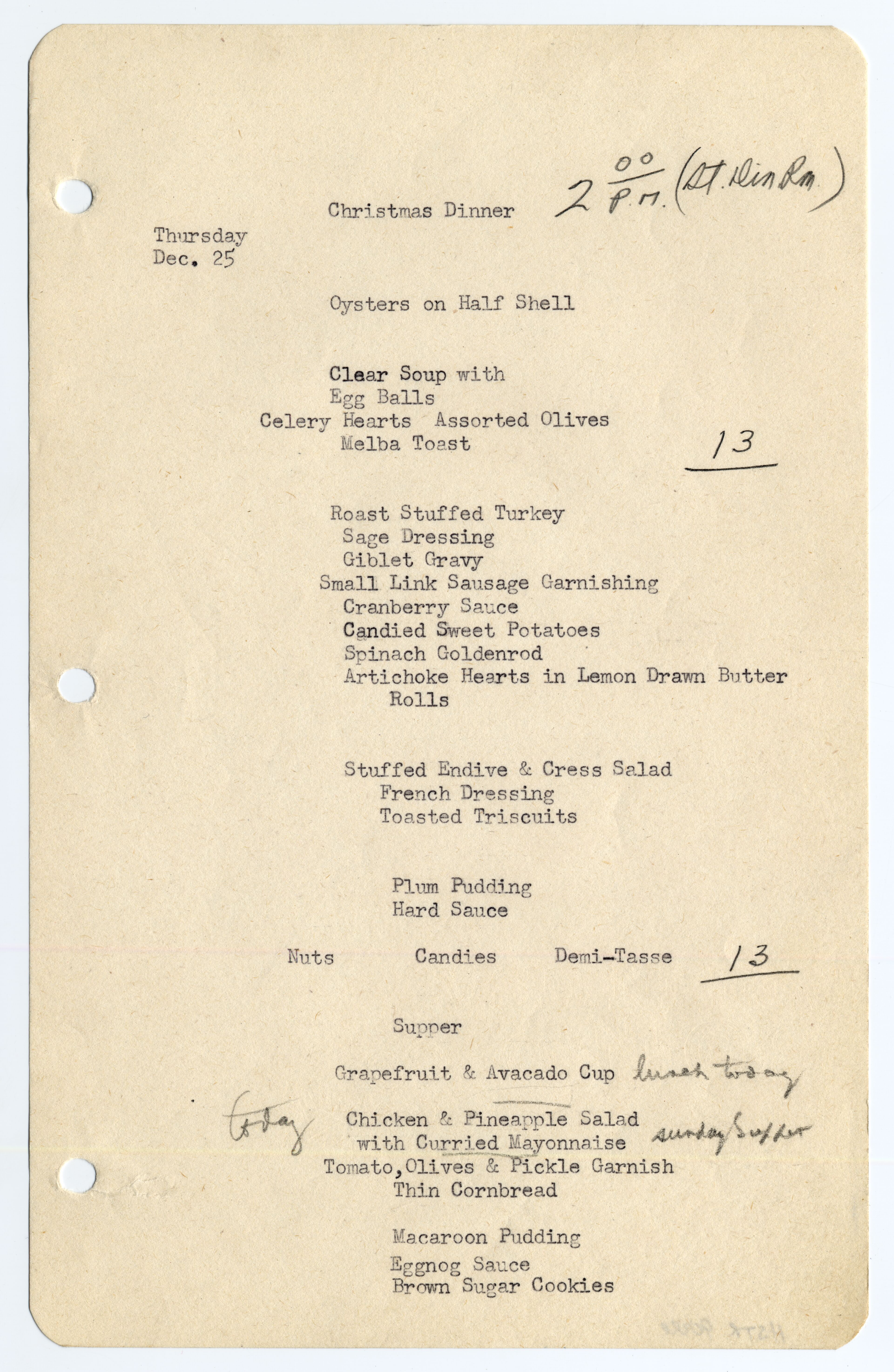 Menus for the Truman's time in the White House from November 1952 to January 1953. There are 81 menus in total. Menus consist of lunch and dinner everyday, including special meals like Cabinet dinners, Thanksgiving, and Christmas meals. Some of the meals have edits made in pencil or notes about how many people and who is going to be gone for the meal.