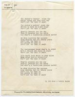 Lyrics for an untitled song by Bob Sour and Bernie Wayne. The lyrics are typed onto white stationary with "Prepared by The Joseph Katz Company, Advertising, Baltimore" printed at the bottom. The song is a political song in support of the Democrats.