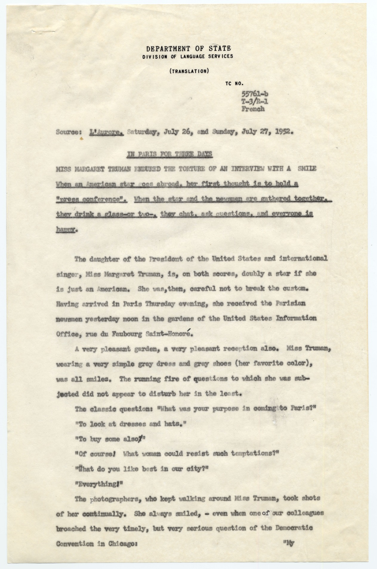 Translations of a newspaper article from a French newspaper. The article is titled "Miss Margaret Truman Endured the Torture of an Interview with a Smile" from L'Aurore.