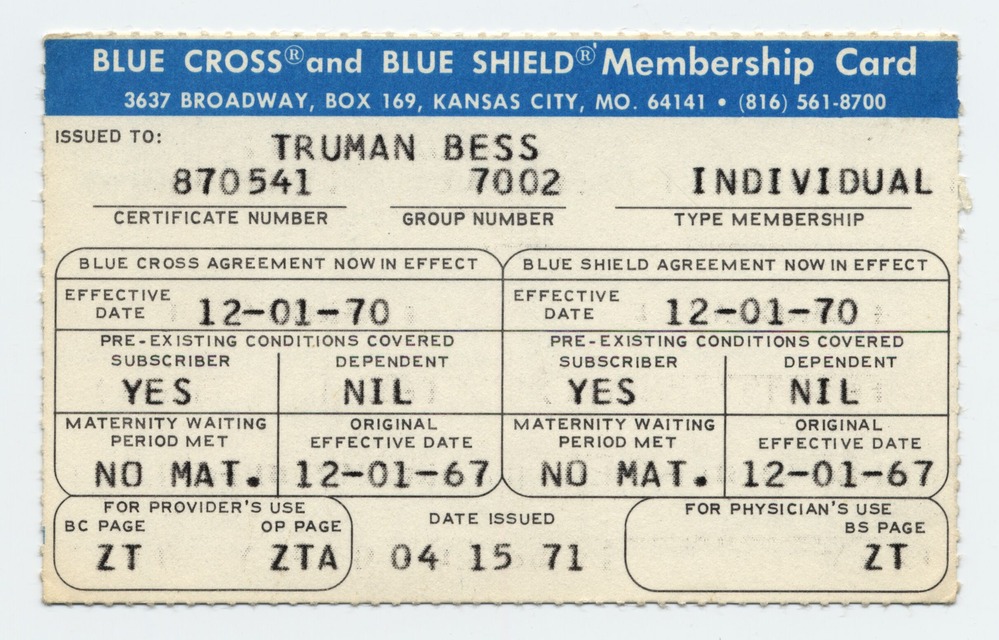 A health insurance card for Bess Truman from Blue Cross and Blue Shield. The card was issued on April 15, 1971.