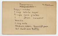 A recipe for Macaroons. The recipe is attributed to M. Bostain and written on a note card. The recipe is part of Bess Truman's recipe collection.