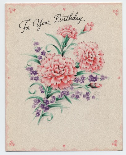 A birthday card with no with no recipient name. The card is signed Helen. The birthday card with pink and purple flowers on the front. Inside, on the left is a handwritten note from Helen and on the right is a printed poem.