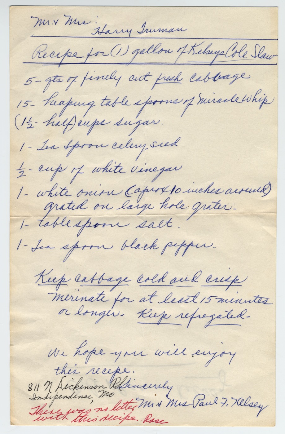 A Letter with a Recipe for a Gallon of Kelsey's Cole Slaw from Bess Truman's Collection