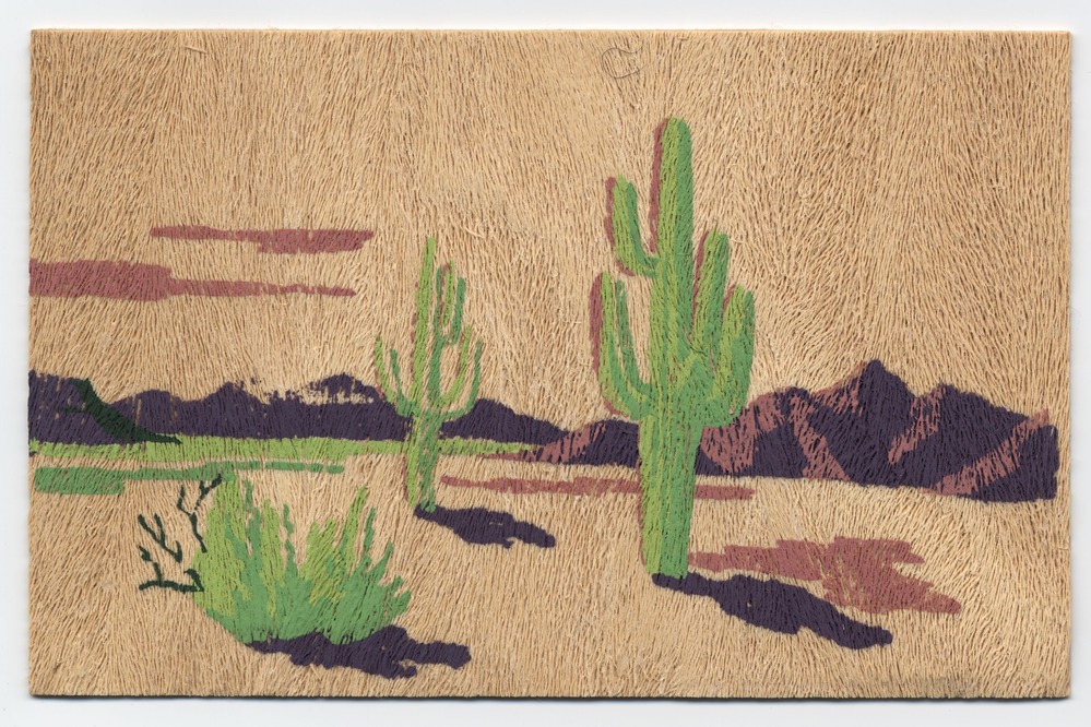 A postcard from Margaret Haverkorst to Bess Truman. The postcard is made out of Yucca wood. On the obverse is a desert landscape scene with cactus and on the reverse is a letter written in brown ink and three gold stickers.