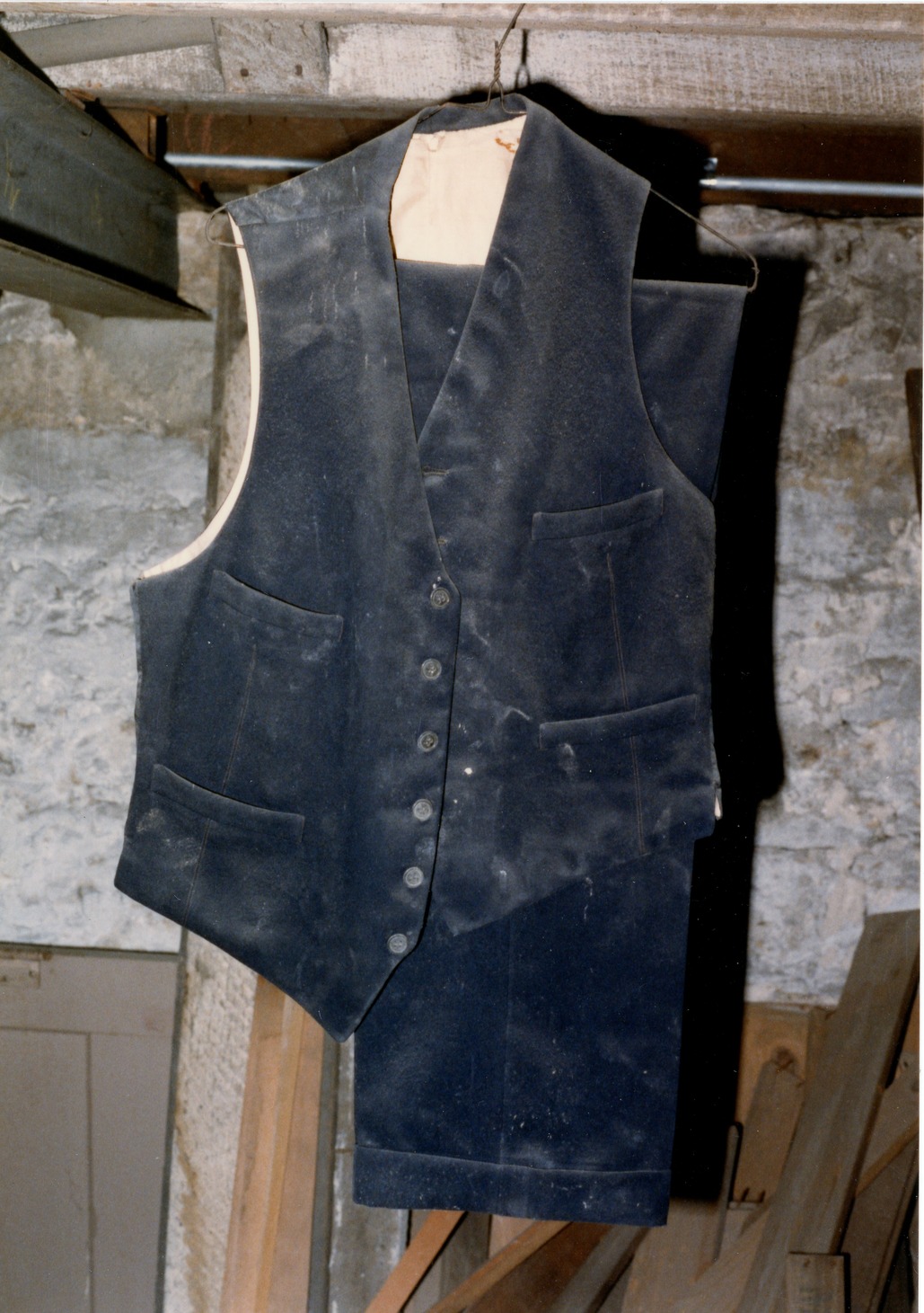Suit vest and pants hanging from pipe, space 004