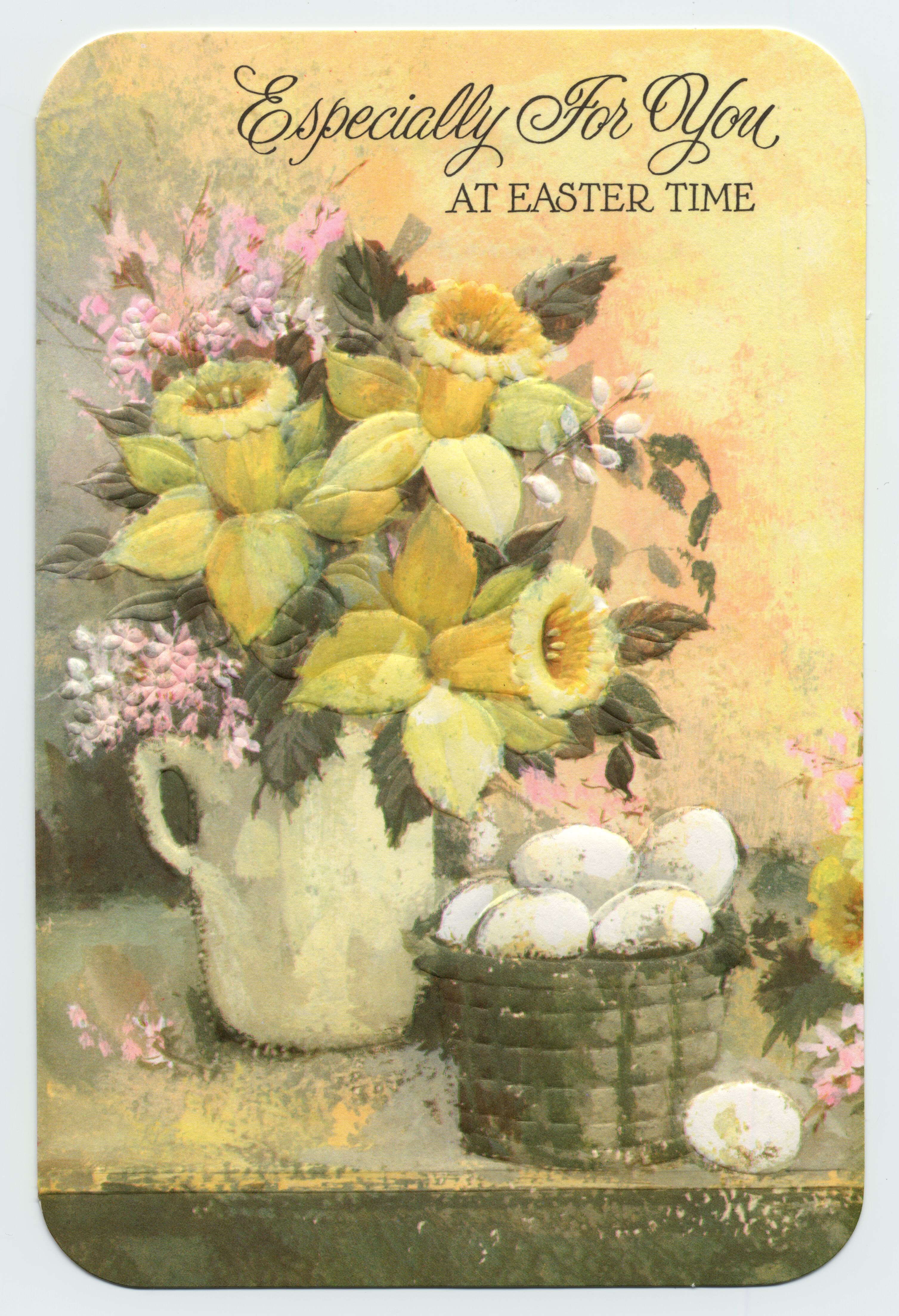 A card with an illustration of daffodils and a basket of eggs on the front.