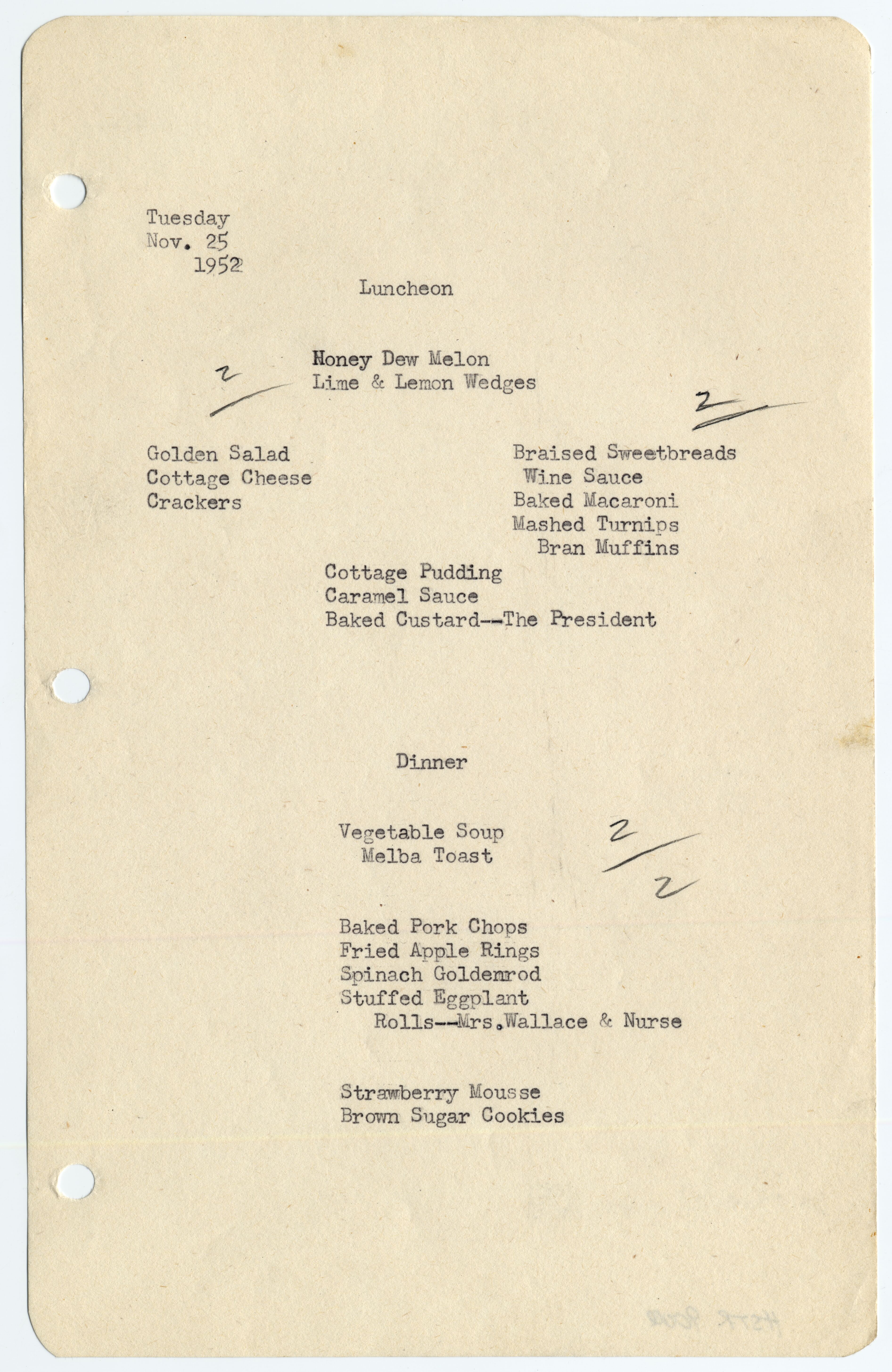 Menus for the Truman's time in the White House from November 1952 to January 1953. There are 81 menus in total. Menus consist of lunch and dinner everyday, including special meals like Cabinet dinners, Thanksgiving, and Christmas meals. Some of the meals have edits made in pencil or notes about how many people and who is going to be gone for the meal.