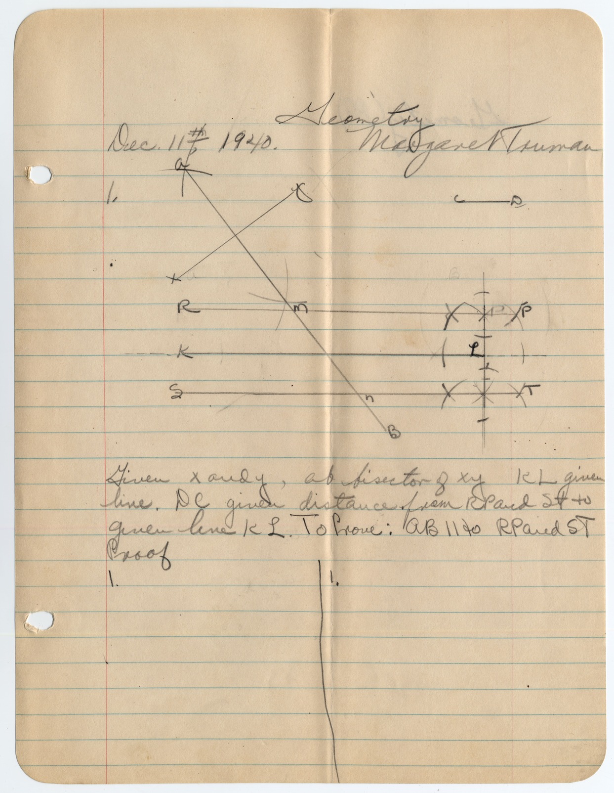 Geometry school work completed by Margaret Truman. Margaret's name, the date, and the title of the class are written at the top of the paper. The work is written on lined notebook paper.
