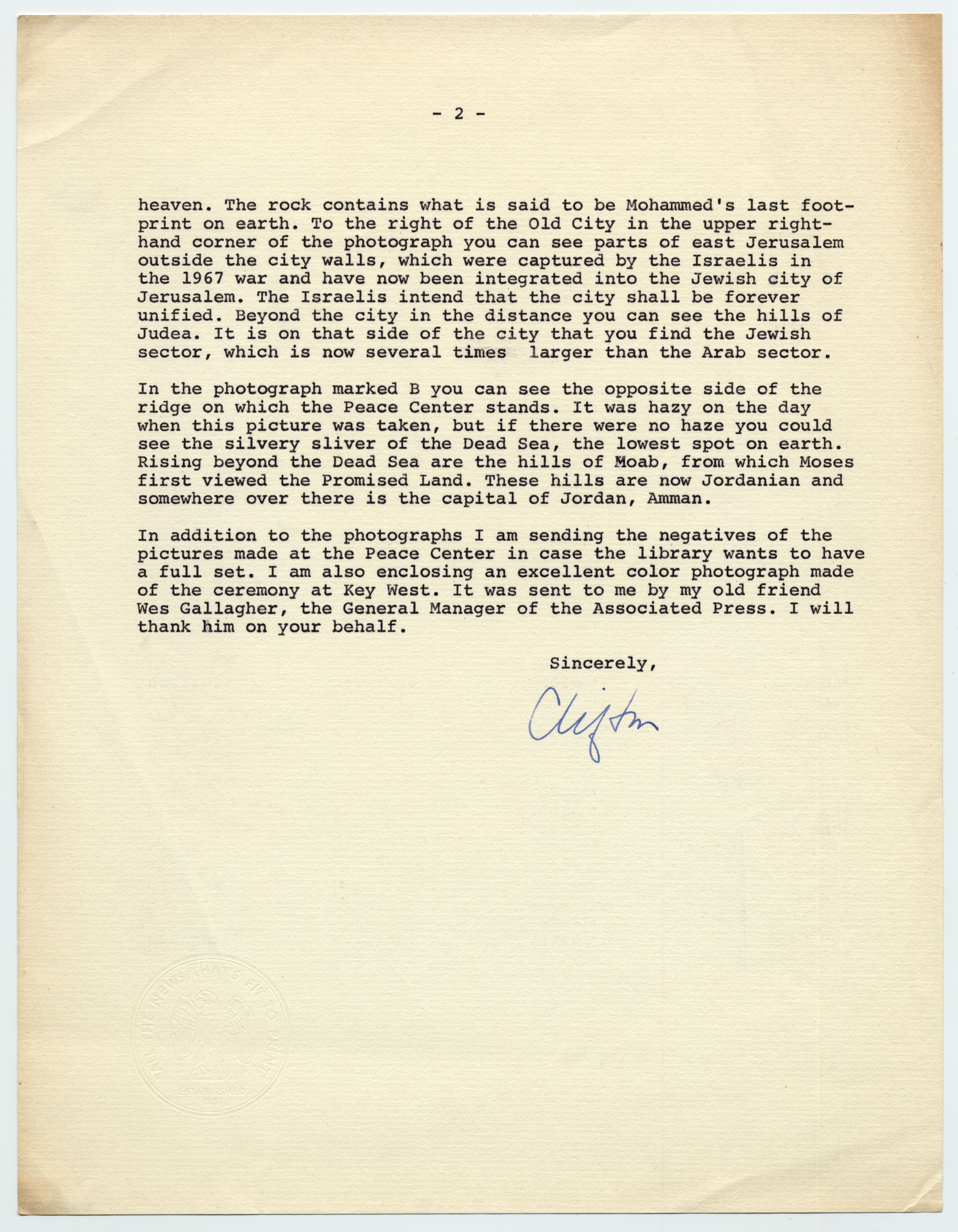 A letter from Clifton Daniel to Harry Truman. The letter talks about Clifton's trip to Israel to see the Harry S Truman Peace Center in Jerusalem. Clifton sent a few photographs to Harry along with the letter. The letter was sent on May 1, 1969.