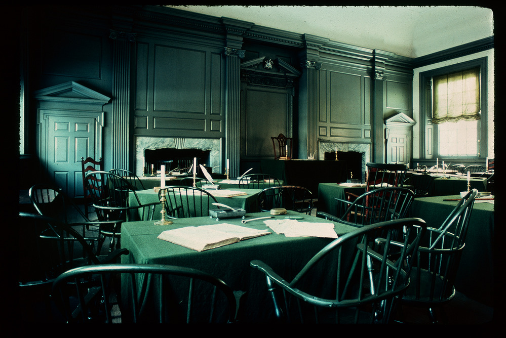"26303517" black stamp, with "9-5-7" (or "19-5-7") written over it in black marker. "60" and "INHP" pencil, "Assembly Room" black pen, "AUG 76 W8" black stamp. "Independence" and NPS Photo by Frear blue stamps. Kodak Kodachrome Duplicate slide.