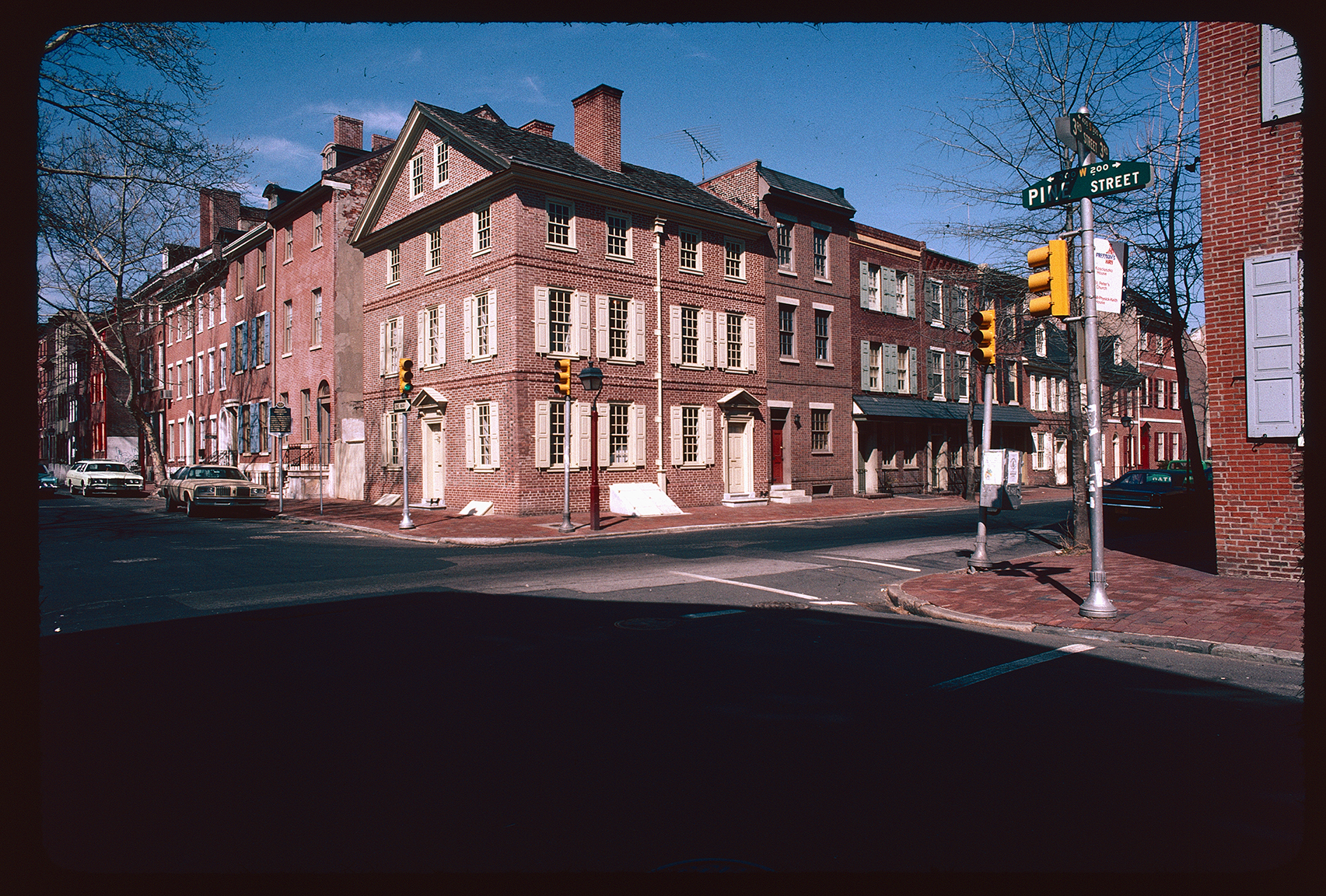 Kosciuszko House. Exterior. East and south side. Looking northwest from southeast corner of 3rd & Pine Streets. Traffic light green. Shutters of house on northeast corner visible.