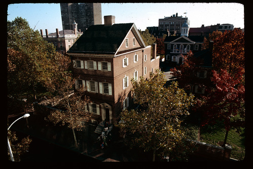 Pemberton House. Exterior. Low aerial view. Looking south past Chestnut Street. Carpenters Hall behind to right.