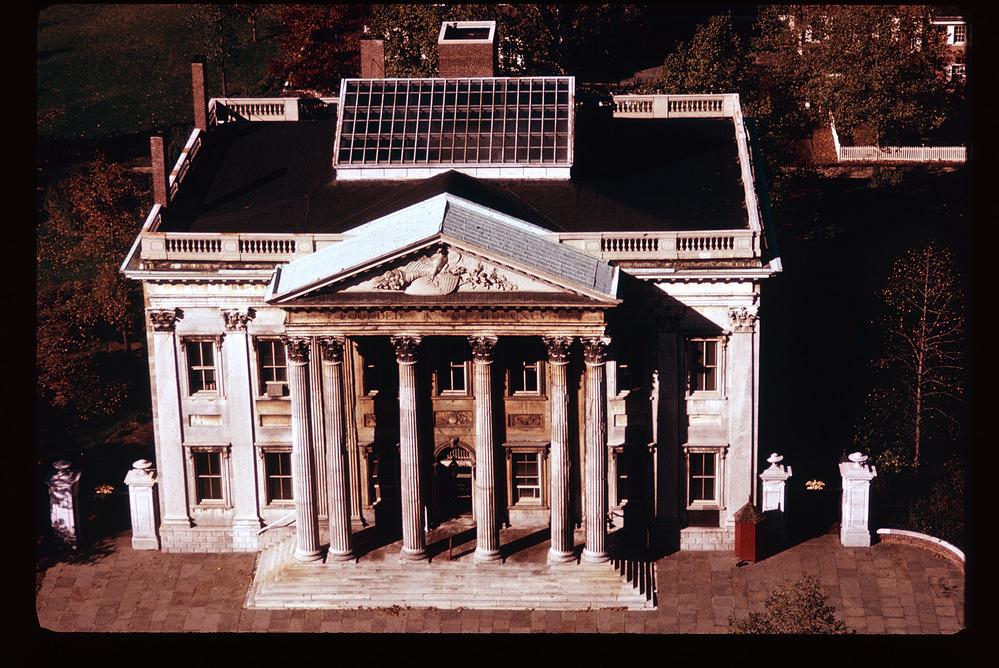 First Bank of the United States. Exterior. Aerial. Front face, looking northwest.