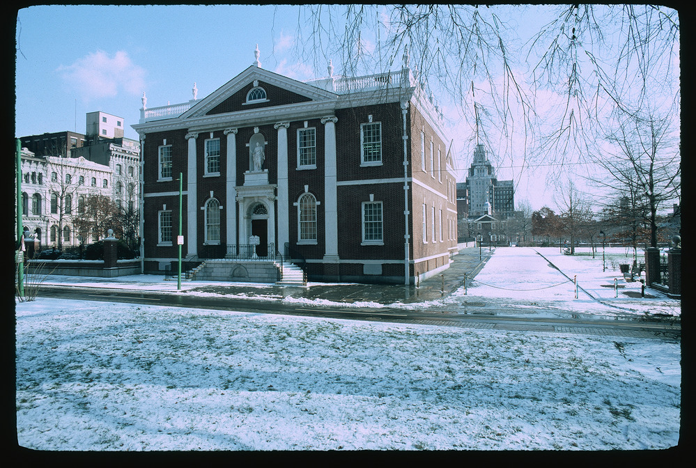 Library Hall. Exterior. Front face. Looking east across 5th Street. Carpenters Hall in background to right, with Custom House behind it. Snow on ground.