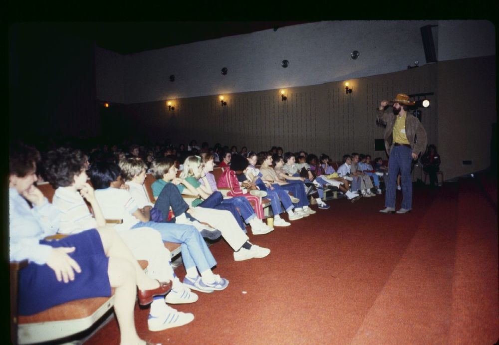 Man performing and view of audience. ; May 1983