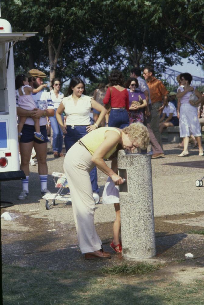 Visitor at a drinking fountain. ; August 1982