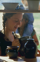 Visitor looking at Jaye Gregory's pottery. ; 1980