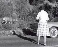 NPS-Parks-Yellowstone NP-Visitor photographing mule deer in Yellowstone. ; 1930s-1990s