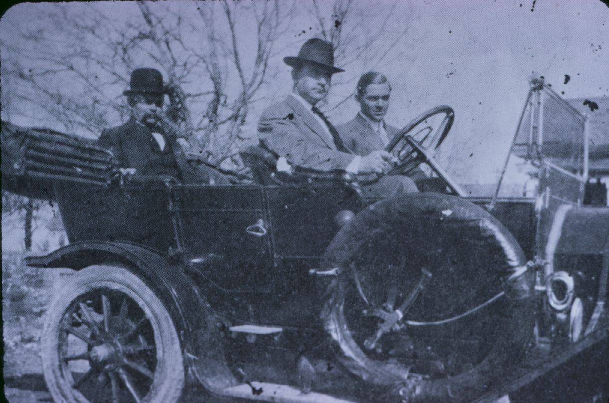 Three men in an open car.