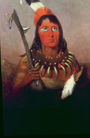 American Indian man and woman leaving the village on horseback (winter scene). (painting) ; September 1992