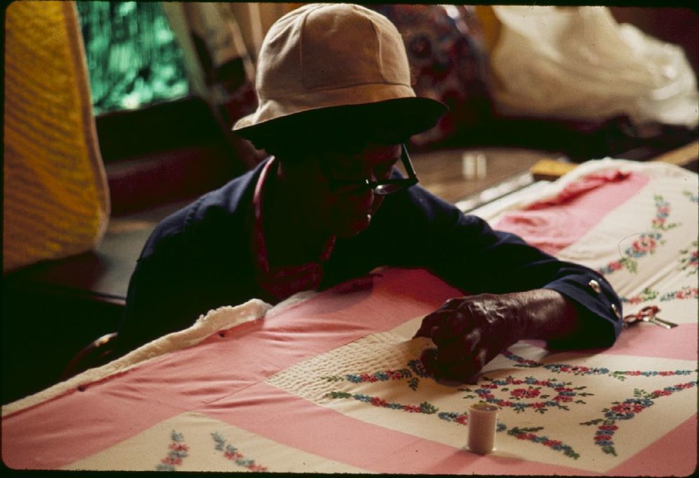 Woman working on a quilt. ; June 1977