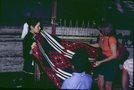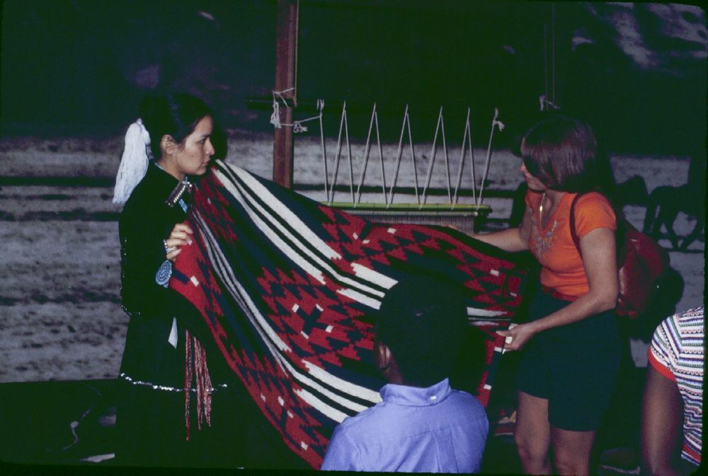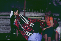 Delphine Curly showing a finished weaving samle to a visitor. ; April 1978