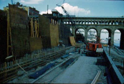 Crane working on railroad tunnel. Eads Bridge in the background ; ca. October 1961