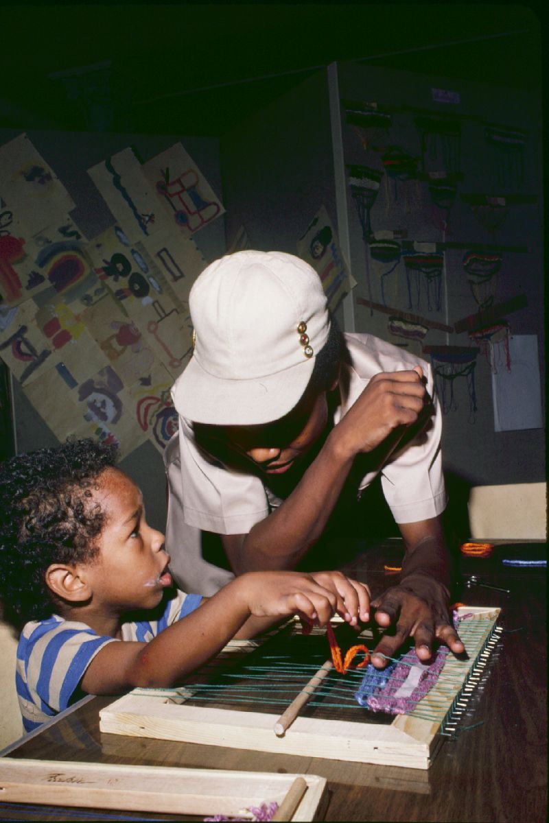 Teacher helping a child weave. ; August 1979