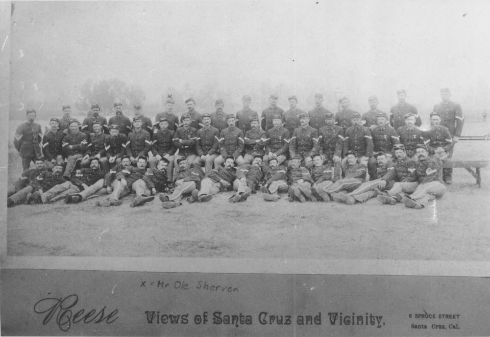 Group photograph of Company D, 1st Infantry, taken in 1887. Ole Sherven is in the last row, sixth from left (marked with an x). This copy photoprint was made ca. 1962 from an original print loaned by Mrs. Astrid Sherven.