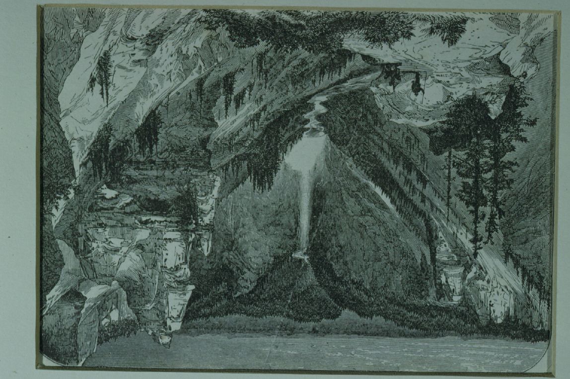 Canyon and lower falls (etching by Moran).
