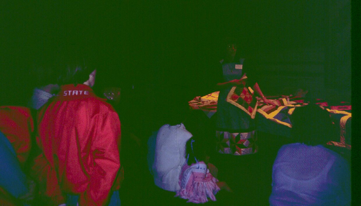 Lois Mueller standing and speaking to visitors about her quilting. ; May 1981
