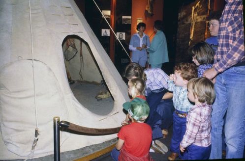 Visitors looking in the tipi. ; May 1979