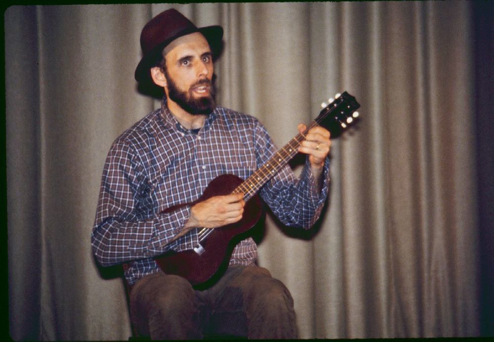 Man with guitar, performing. ; May 1983