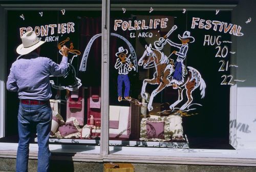 Glenn Ohrlin, painting a window mural. ; August 1982