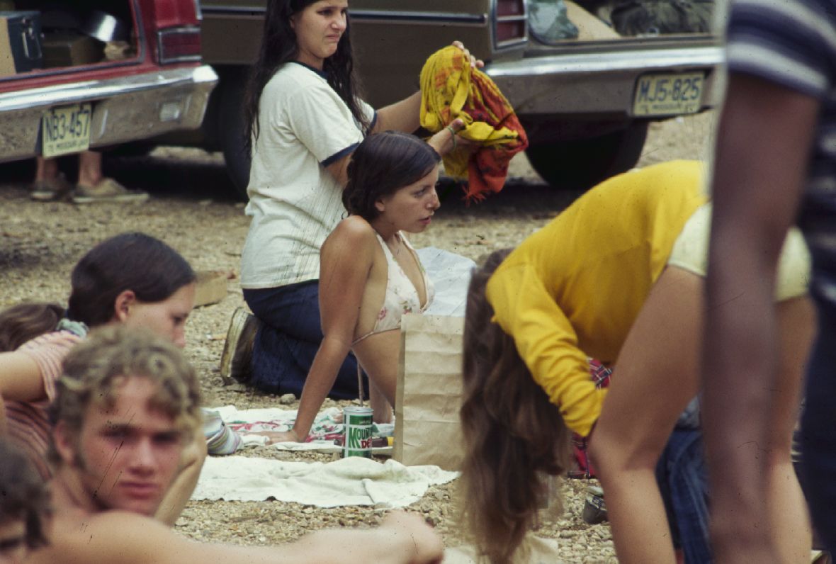 Resting on the gravel bar during the float trip. ; August 1974